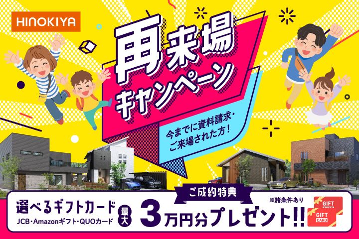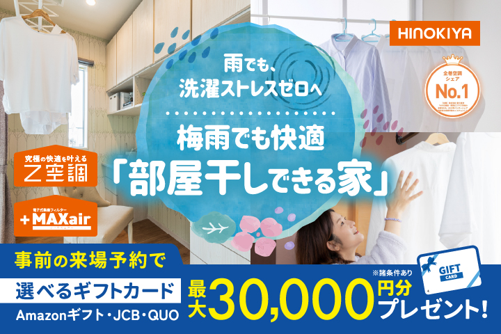 日程 4月1日(水)~30日(木) 梅雨でも快適☆部屋干しのできる家♪ 「洗濯物が乾かない…」「リビングが干し場に…」そんなお悩みありませんか? 桧家住宅では、ママの家事ラクを応援する「部屋干しができる家」を公開中! 全館空調でカラッと乾くから、雨の日も花粉も、夜のお洗濯だって怖くありません。 いつでもスッキリ片付く魔法の間取りを、ぜひご家族で体感しに来てください☆ 今なら事前予約で、うれしい選べるギフトカードもプレゼント中! 毎日の暮らしがもっと楽しくなるヒントを、一緒に見つけましょう! こんな人におすすめ! 家づくりの参考に、まずは体感から始めましょう! そもそもZ空調ってなに? Z空調は、家中どこでも快適な温度を保てる桧家住宅の全館空調システム。 なんと、24時間365日、家全体を快適な温度に保ちます! そして桧家住宅は全館空調シェアNo,1の第一人者です。 電気代も安い! 「家中の空調をつけっぱなしにしたら電気代は高いでしょ」 そんなみなさんの心の声が聞こえてきます。 しかしZ空調は電気代も安いんです! その秘密は桧家住宅の高気密・高断熱の構造にあります。 簡単に言えば、家のいたる所で熱が伝わりづらく、隙間が少ないように工夫を凝らすことで、 家全体が水筒のように熱を逃さないようにしています! 賃貸アパートは利益追求のため基本的に機密性や断熱性が低いですし、 昔の住宅もそこまで気にされておりませんでした。 つまり、大体の方の今現在の電気代よりも安くなります! 24時間つけっぱなしでも、月々の電気代が安くなるお家 気になりませんか? こちらが実際の電気代です。 実際の涼しさ、体感できます ただいま桧家住宅のモデルハウスでは、実際にZ空調を体感していただけます。 さらに!モデルハウスは全てリアルサイズで、 さまざまなテイストの内装を一度にご覧いただきます。 ジャパニーズモダンスタイル ニューヨークビンテージスタイル ラグジュアリーモダンスタイル ご来場お待ちしております! 桧家住宅 高知【高新住宅総合展示場ライム内】 ご来場特典:選べるギフトカード30,000円分プレゼント! 【ご来場プレゼント進呈条件】 〈初回来場特典(1万円分)〉 ・はじめて弊社主催のイベントまたは店舗へご来場される方 ※過去にご来場いただいた方(他店舗含む)は対象外となります。 ・入居予定の成人の方が全員ご来場いただくこと ・事前の内容確認のお電話にご対応いただける方 ・弊社対応エリア内で、1年以内にお家づくりをご検討されている方 ※2回目のお打ち合わせの際にお渡しいたします。 〈平日のお打ち合わせ特典(1万円分)〉 ・平日にお打ち合わせを実施された方 〈お施主様邸見学特典(1万円分)〉 ・お施主様邸の見学案内をされて、実際に見学をされた方 ※来場特典は【身分証をご提示いただいた方】が対象となります。あらかじめご了承ください。 ※全ての条件を満たし、施工可能エリアにて真剣にお家づくりをご検討されていると、当社スタッフが判断した方限定の特典となります。 【キャンペーンに関する注意事項】 弊社主催の他イベントおよびキャンペーンの来場特典との併用は不可となります。 詳しくはスタッフまでお問合せください。 お子様連れの方もご安心ください! モデルハウスには、安心してご見学いただけるようキッズスペースをご用意しております。 お子様が楽しく遊んでいる間に、ゆっくりと家づくりのご相談が可能です。 ご家族そろって、ぜひお気軽にお越しください! 皆様のご予約・ご来場、心より心よりお待ちしております!