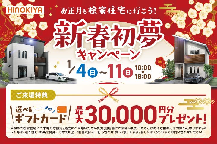 日程 1月4日(日)~31日(土) 新春初夢キャンペーン 開催! 1月4日(日)〜11日(日)までの期間限定で「新春初夢キャンペーン」を開催いたします! 先着50組様限定で福袋のお渡しや、お菓子詰め放題など、 ご家族で安心して楽しめる企画をご用意しております☆モデルハウス見学とあわせてお正月ならではの特典をお受け取りいただけます。ぜひこの機会に桧家住宅の住まいをご体感ください。 新春初夢キャンペーン企画!最大200万円分 選べるオプションプレゼント! 1月31日(土)までにご契約いただいたお客様限定で、人気オプションを最大200万円分プレゼントする特別企画も同時開催!【限定5組】 TVボード、バルコニー、キッチン、洗面化粧台、フラット対面キッチンなど、暮らしをグレードアップする多彩な商品からお選びいただけます。 そして桧家といえばZ空調! Z空調は、家中どこでも快適な温度を保てる桧家住宅の全館空調システム。 なんと、24時間365日、家全体を快適な温度に保ちます! そして桧家住宅は全館空調シェアNo,1の第一人者です。 電気代も安い! 「家中の空調をつけっぱなしにしたら電気代は高いでしょ」 そんなみなさんの心の声が聞こえてきます。 しかしZ空調は電気代も安いんです! その秘密は桧家住宅の高気密・高断熱の構造にあります。 簡単に言えば、家のいたる所で熱が伝わりづらく、隙間が少ないように工夫を凝らすことで、 家全体が水筒のように熱を逃さないようにしています! 賃貸アパートは利益追求のため基本的に機密性や断熱性が低いですし、 昔の住宅もそこまで気にされておりませんでした。 つまり、大体の方の今現在の電気代よりも安くなります! 24時間つけっぱなしでも、月々の電気代が安くなるお家 気になりませんか? こちらが実際の電気代です。 Z空調こんな人におすすめ! 家づくりの参考に、まずは体感から始めましょう! 実際の涼しさ、体感できます ただいま桧家住宅のモデルハウスでは、実際にZ空調を体感していただけます。 さらに!モデルハウスは全てリアルサイズで、 さまざまなテイストの内装を一度にご覧いただきます。 ジャパニーズモダンスタイル ニューヨークビンテージスタイル シックモダンスタイル ご来場お待ちしております! 桧家住宅 高知【高新住宅総合展示場ライム内】 ご来場特典:選べるギフトカード30,000円分プレゼント! 【ご来場プレゼント進呈条件】 〈初回来場特典(1万円分)〉 ・はじめて弊社主催のイベントまたは店舗へご来場される方 ※過去にご来場いただいた方(他店舗含む)は対象外となります。 ・入居予定の成人の方が全員ご来場いただくこと ・事前の内容確認のお電話にご対応いただける方 ・弊社対応エリア内で、1年以内にお家づくりをご検討されている方 ※2回目のお打ち合わせの際にお渡しいたします。 〈平日のお打ち合わせ特典(1万円分)〉 ・平日にお打ち合わせを実施された方 〈お施主様邸見学特典(1万円分)〉 ・お施主様邸の見学案内をされて、実際に見学をされた方 ※来場特典は【身分証をご提示いただいた方】が対象となります。あらかじめご了承ください。 ※全ての条件を満たし、施工可能エリアにて真剣にお家づくりをご検討されていると、当社スタッフが判断した方限定の特典となります。 【キャンペーンに関する注意事項】 弊社主催の他イベントおよびキャンペーンの来場特典との併用は不可となります。 詳しくはスタッフまでお問合せください。 お子様連れの方もご安心ください! モデルハウスには、安心してご見学いただけるようキッズスペースをご用意しております。 お子様が楽しく遊んでいる間に、ゆっくりと家づくりのご相談が可能です。 ご家族そろって、ぜひお気軽にお越しください! 皆様のご予約・ご来場、心より心よりお待ちしております!