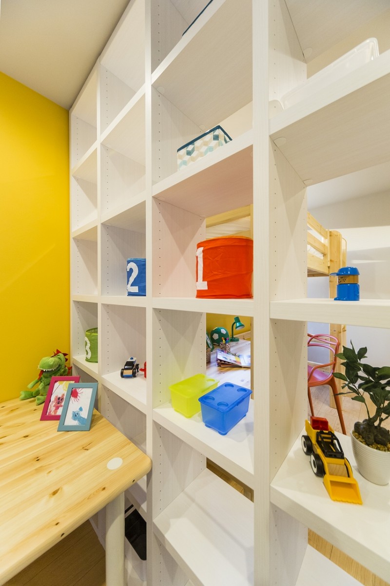 最初、広めの子ども部屋をつくっておいて、子どもが小さいうちは遊ぶ場所として使い、個室が必要になってきたら、仕切り家具を使って仕切って個室を作ることが可能です。