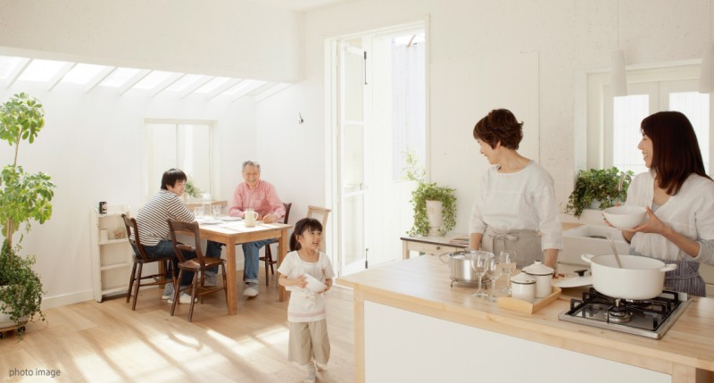 リビングやキッチンなど基本的な生活空間をすべて共有し、二世帯が一緒に暮らす古き良き日本のスタイルです。