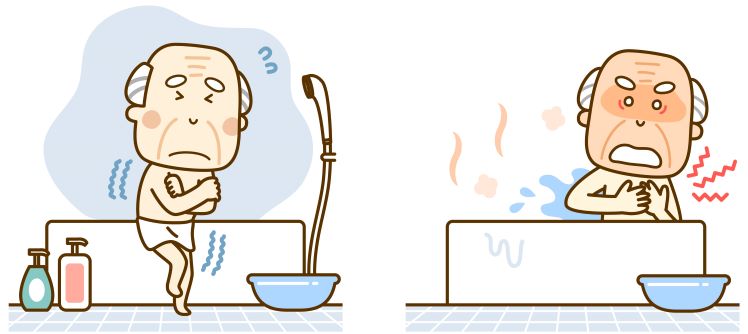 ヒートショックは、冬場に暖房の効いたリビングから脱衣所に移動し、浴槽に入るときなどに起こります。