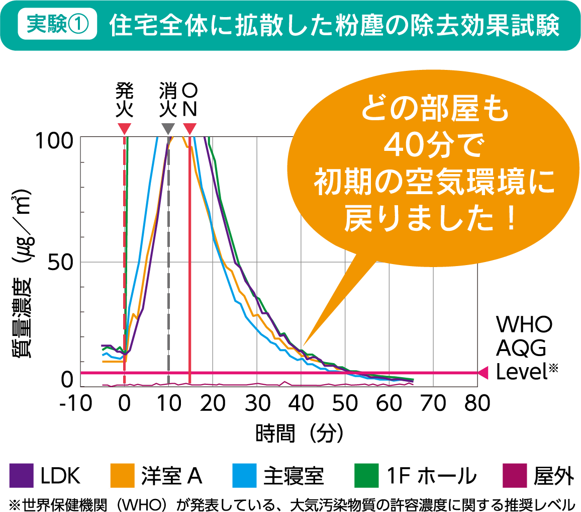 こちらのグラフは横軸が“時間”、縦軸が“質量濃度”といって大気汚染物質の濃度を表す指標で、ピンクの横線はWHOが発表している大気汚染濃度の推奨レベルとなっています。線香をたくと、一時的に濃度は上がりますが、約40分で元の空気環境に戻りましたので、粉塵がしっかり除去されている事が分かります。