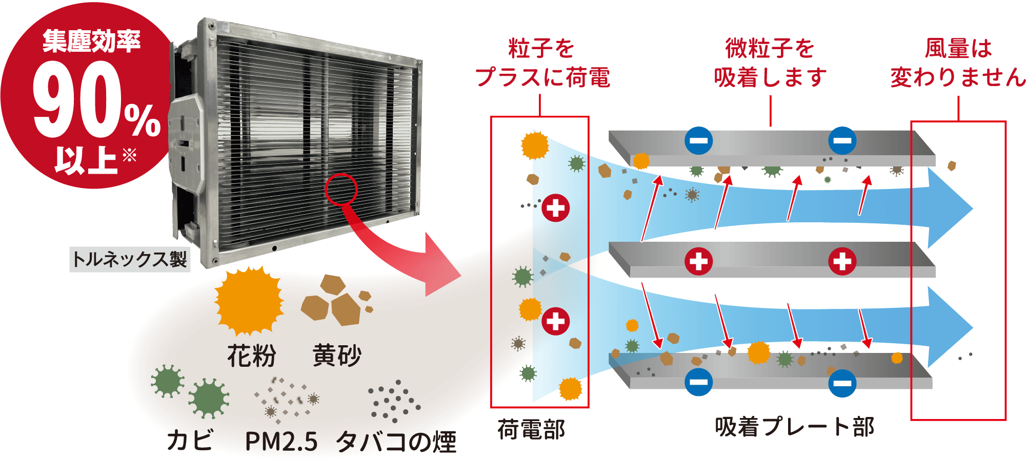 従来のフィルタでは捕集しきれなかった小さな汚れも、電気の力を利用して強力に吸着します。