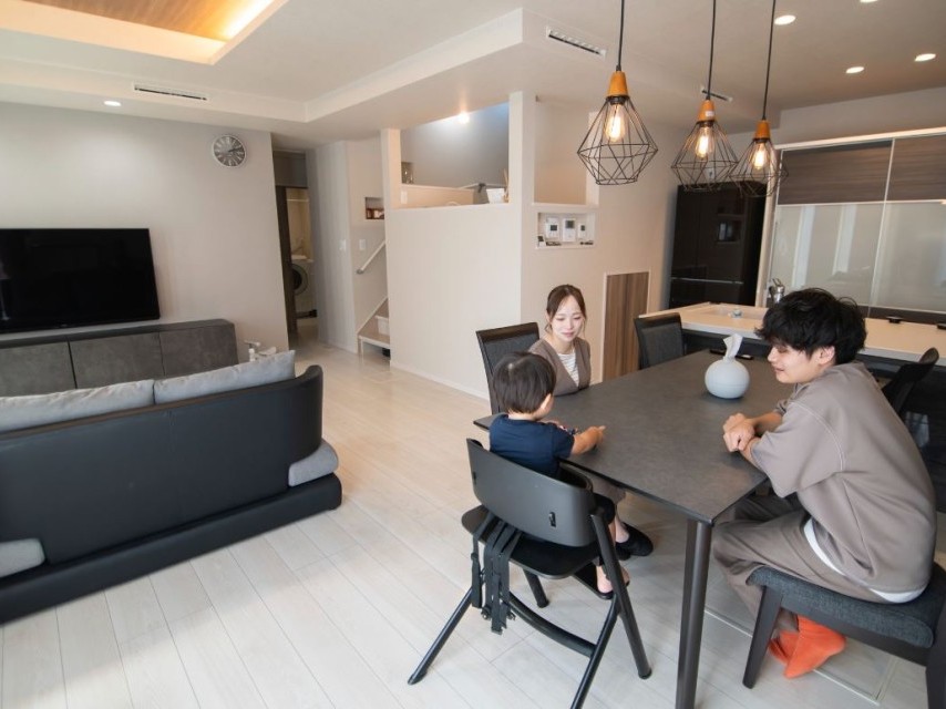 「家族が 1 番過ごす場所なので広いリビングにしたかった。折り上げ天井を採用し、壁掛けテレビの配線が見えないように空配管を作ってもらいました。」とM様。細かなところまでこだわりを詰め込んだLDK。