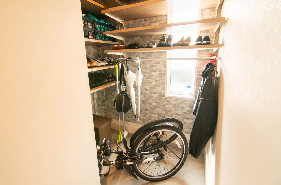 「玄関を広く取るために思い切って下駄箱をなくし、その分シューズクローゼットにしっかり収納できるようにした。ベビーカーや自転車も収納できるので大変助かっています。」とM様。家族全員分のオールシーズンの靴を収納できるように広く収納を設けました。