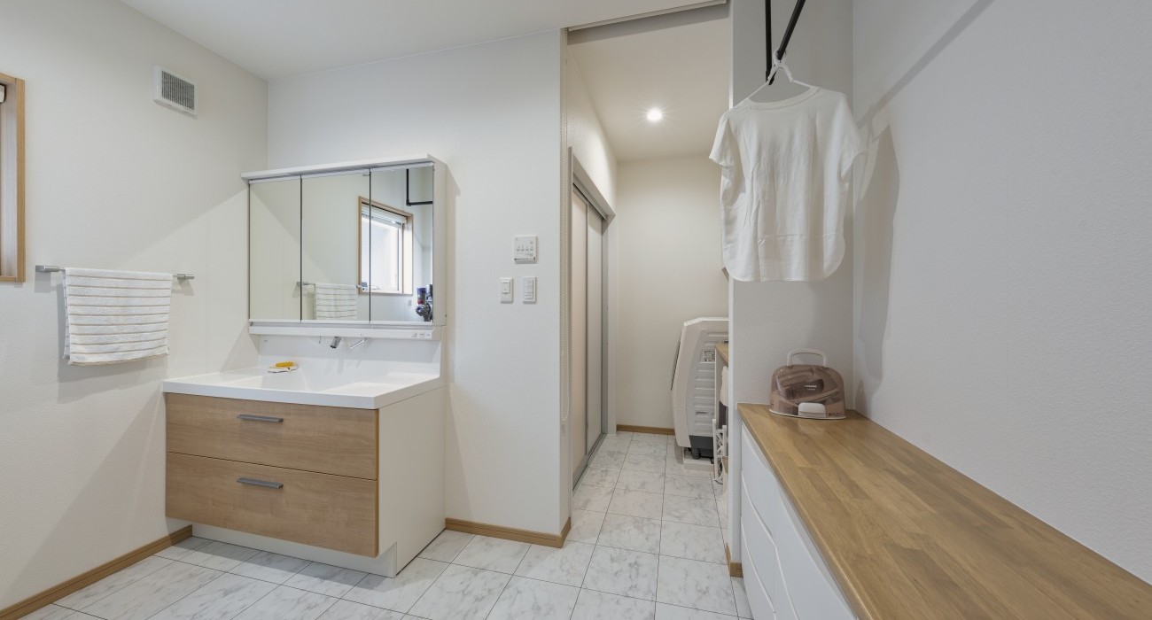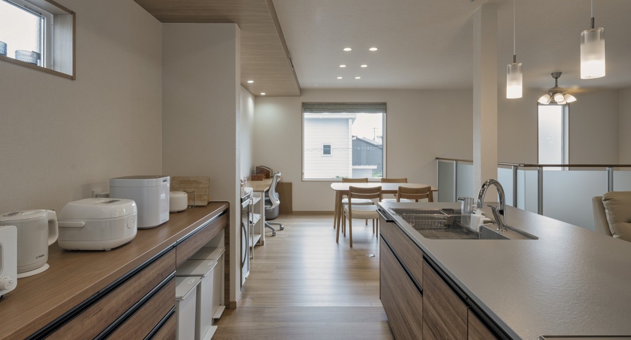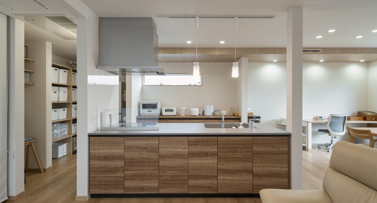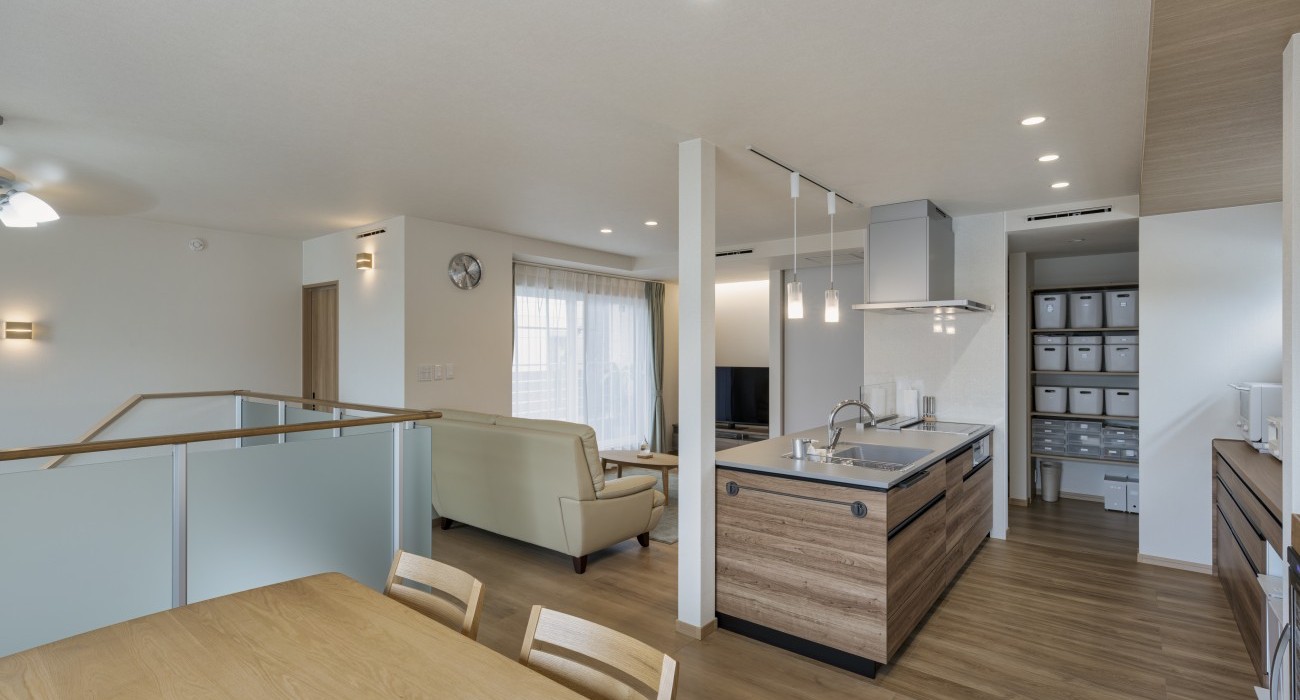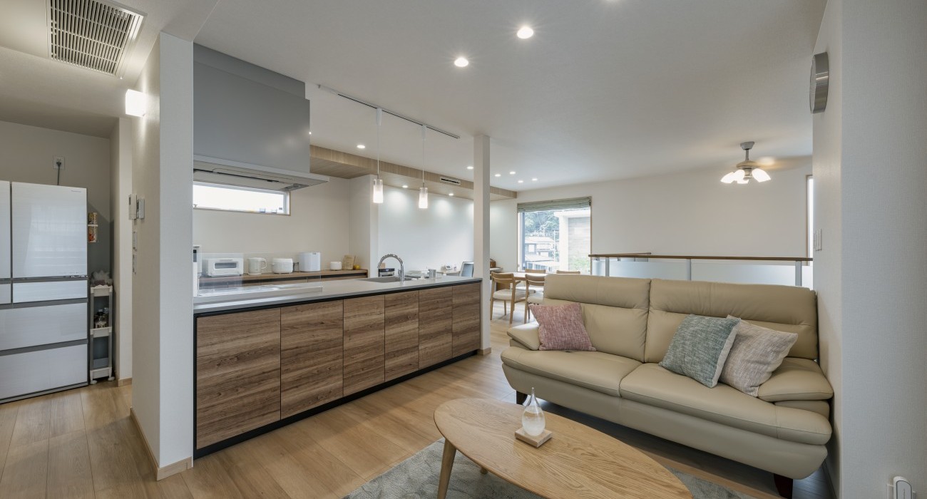 明るく開放的なキッチンと、ソファを中心に家族や友人が自然と集まるリビング。料理をしながら会話も楽しめる、人がつながる空間を実現しました。