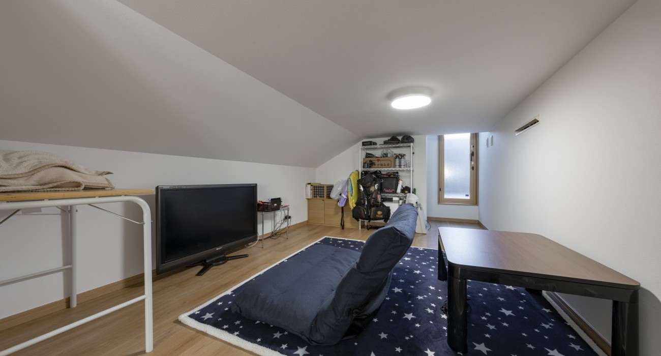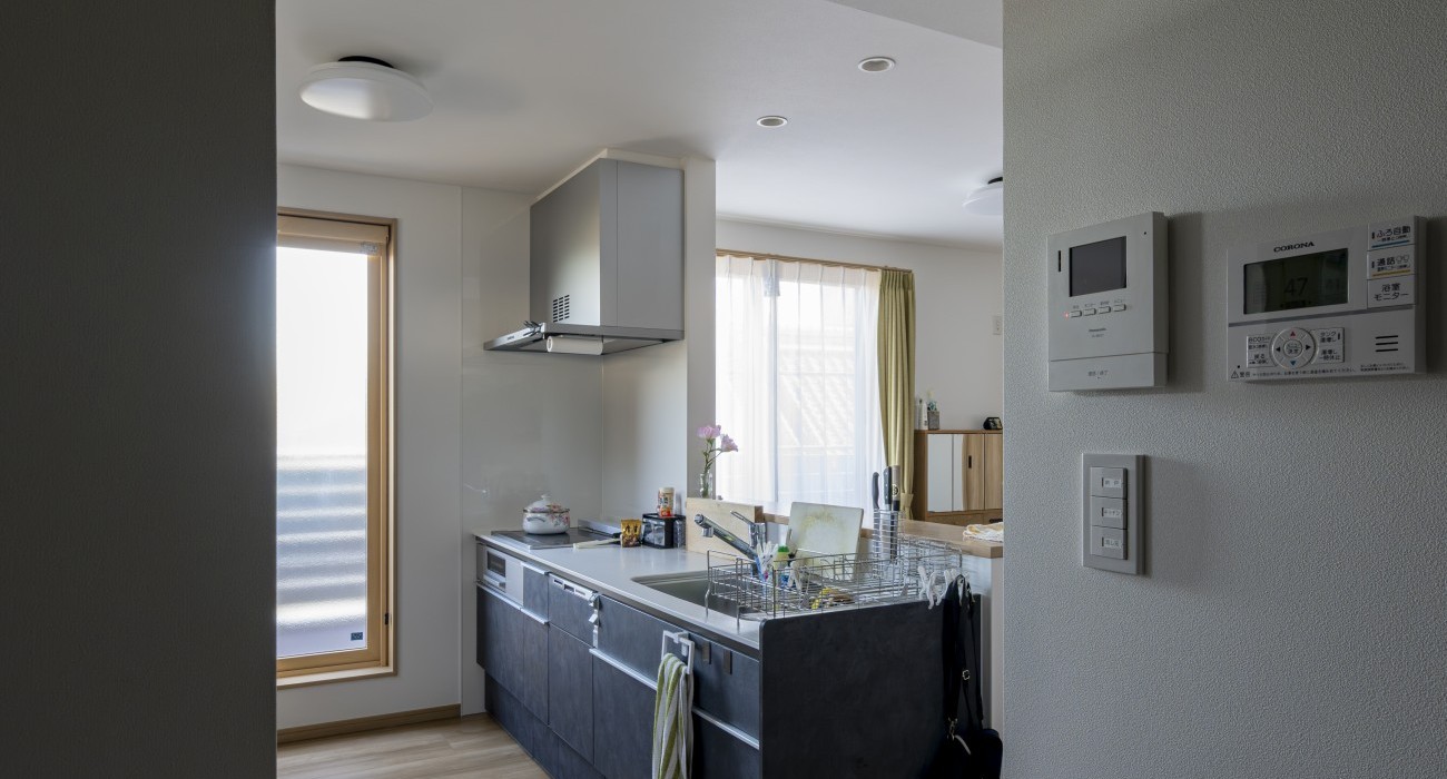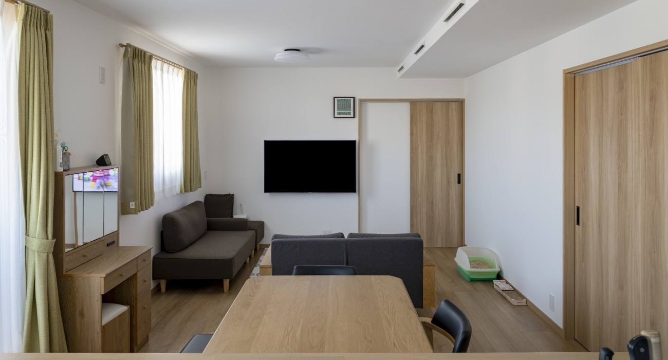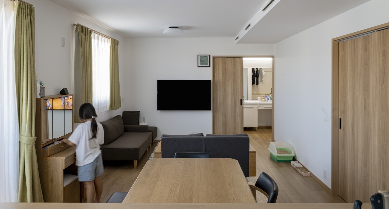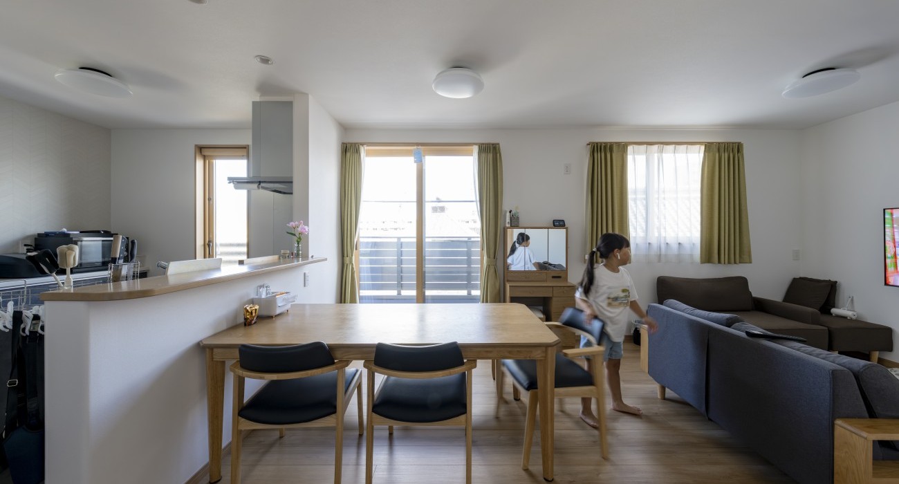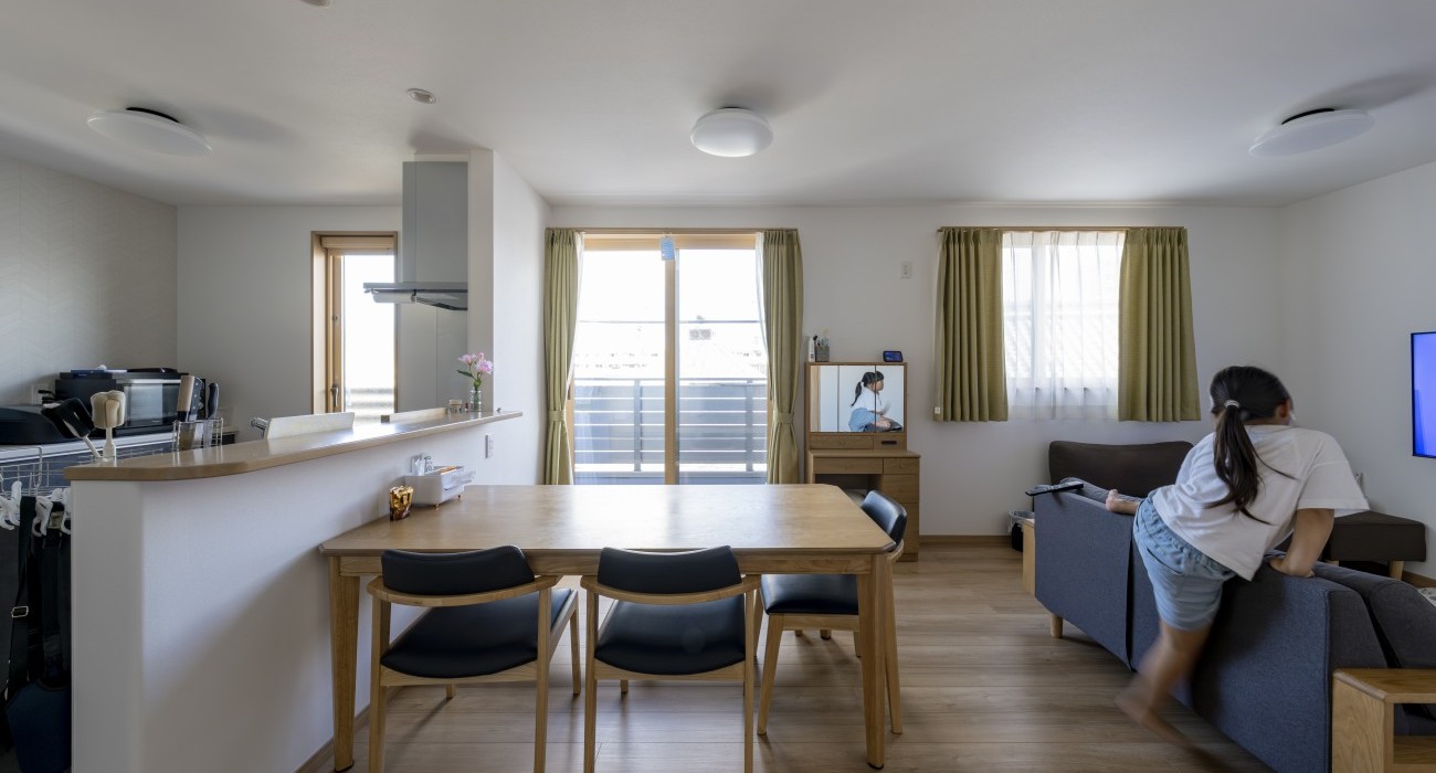 シンプルで落ち着いた外観の先に広がるのは、ダイニングとソファーを備えた居心地のよいリビング。子どももゆったりと過ごせる、家族時間を大切にした住まいです。
